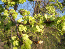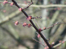 Blütenknospen an den Zweigen lassen diese Baumart im Winter gut bestimmen. Die Berg-Ulme mit ihrer